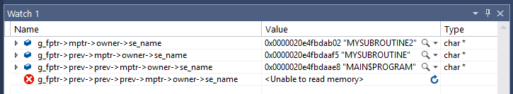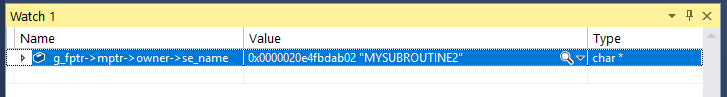 - Under the Name column, type “g_fptr->mptr->owner->se_name”. The Value field should populate with the name of the routine that was running when the dump file was generated: