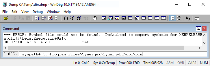- If you’re analyzing the dump file on the same system where it was created, or on a system with the same version of Synergy, Visual Studio should automatically load the dbr.pdb file and be able to access the symbols. But if you’re analyzing the file on a system with a different version of Synergy or Synergy is not installed at all, you’ll probably see a message that says “dbr.pdb not loaded.” In that case,