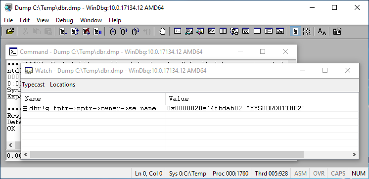 The “dbr!” part of the name tells the debugger which module we want and helps it locate the correct symbols. The name of the routine should be in the Value column: