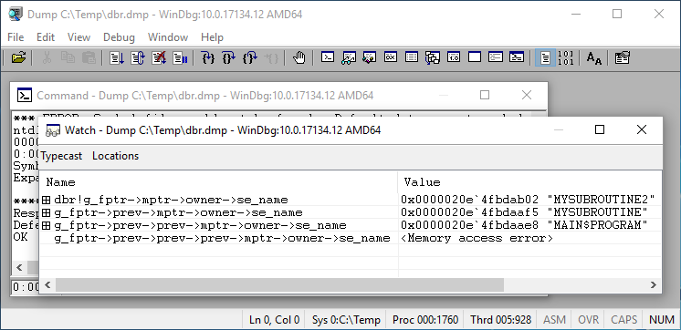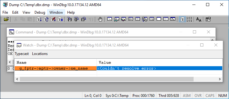 Note that the “dbr!” prefix is no longer necessary, now that the debugger knows where to look for the symbols. But if you had started out without specifying “dbr!”, you might have gotten a “<Couldn’t resolve error>” message.